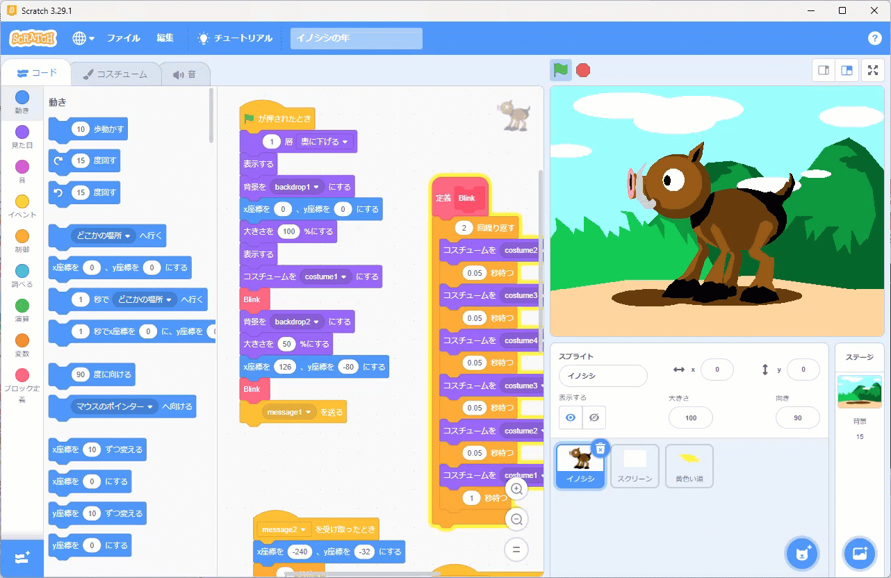 Scratchでキャラクターを動かしたり、 メッセージをアニメーションさせたりして、 自分だけの年賀状作品を作ります。 完成した作品はQRコード化して印刷し、 本当の年賀状としてお渡しできます。 「おじいちゃんに送る!」 「冬休みの作品にしたい!」 など、生徒からも人気の高いイベントです。授業の進行に必要な台本、テンプレート、印刷用データ、そして講師向けガイド動画をすべてご用意しています。